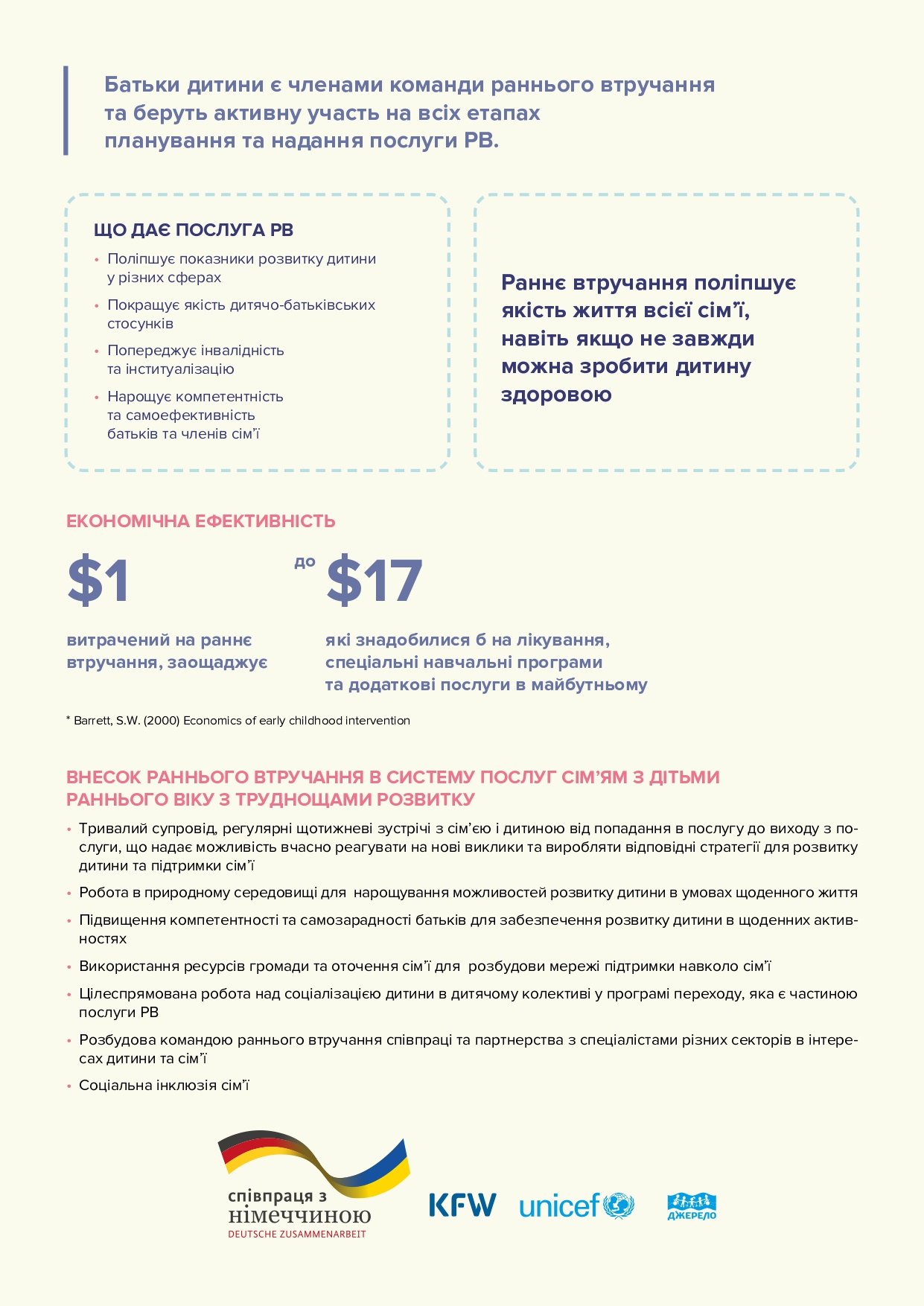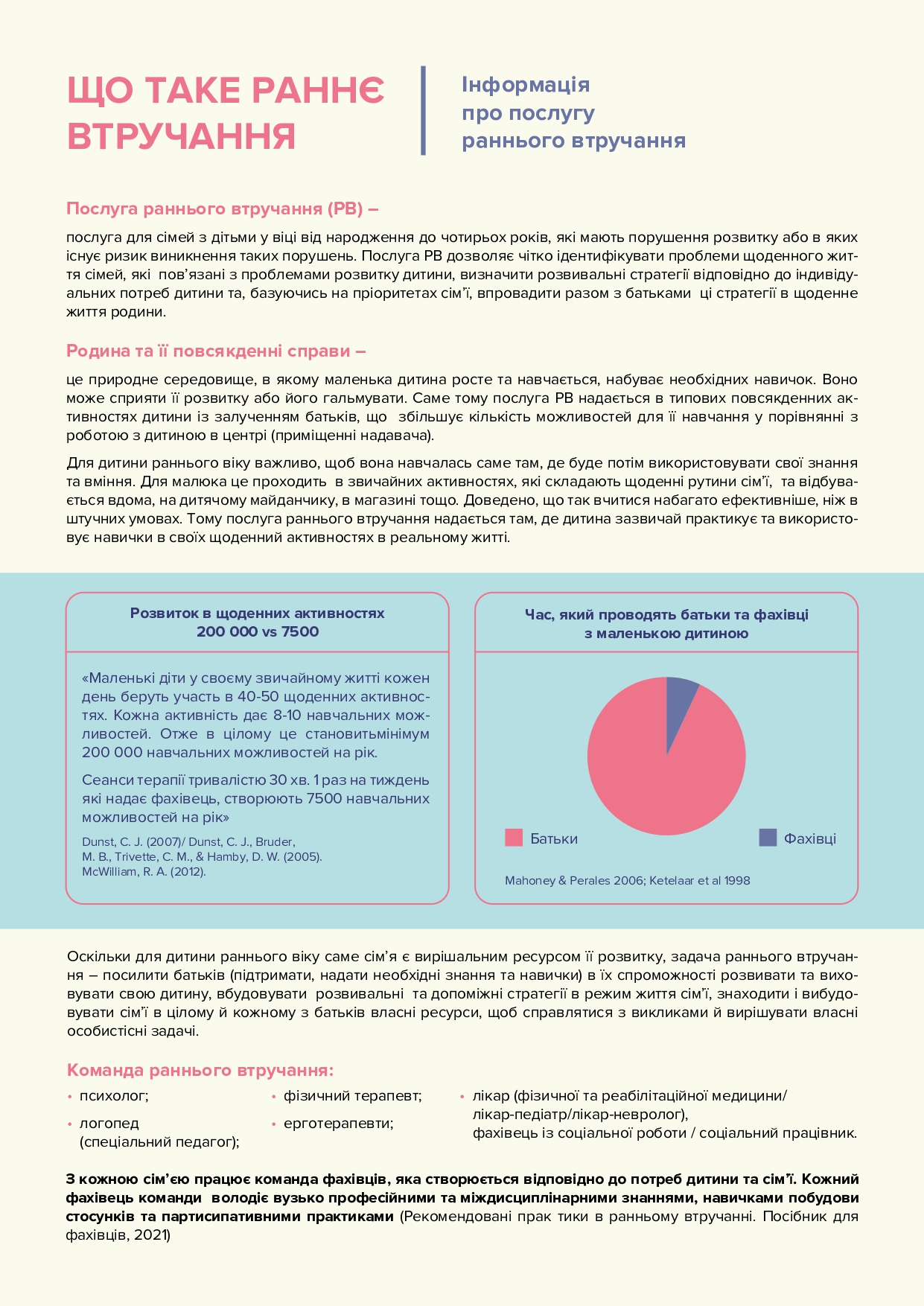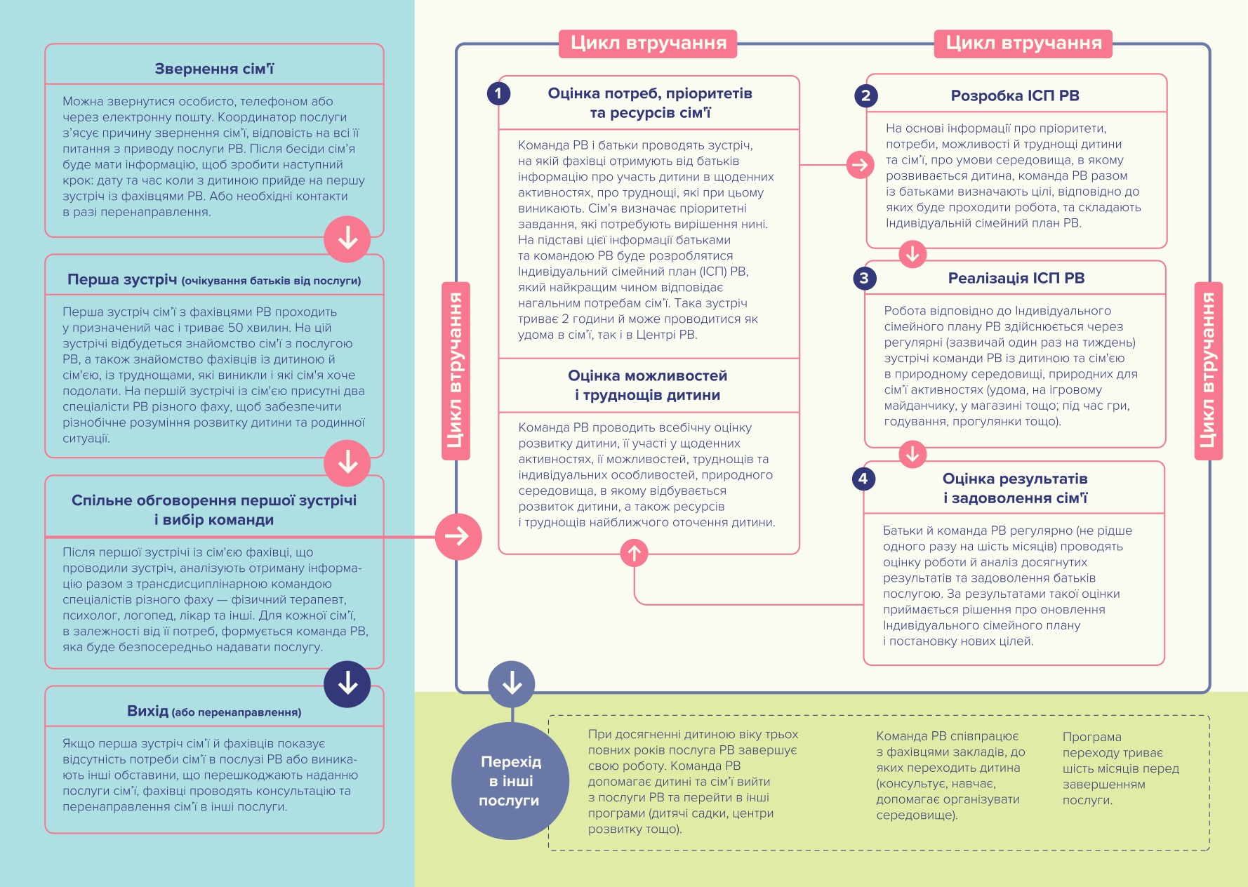 Раннє втручання – це система послуг та підтримки для дітей до 4-х років, які виявляють порушення у розвитку або мають ризик їх виникнення. Мета раннього втручання полягає у виявленні та адекватній реакції на можливі проблеми або відхилення у розвитку дитини на ранніх етапах, щоб оптимізувати її можливості для здорового та гармонійного розвитку.